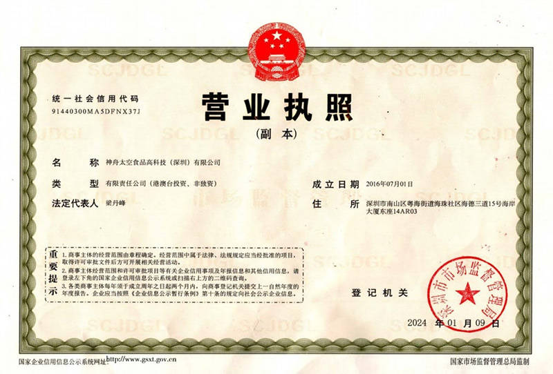 神舟太空食物高科技(深圳)无限公司独家具有中国航天员科研锻炼核心的空间坐航天员食物专利手艺——《空间坐航天员高能压缩食物及其制法》,航天员食物不答应添加防腐剂,正在特殊食物范畴可谓一项严沉冲破。公司承担着我平易近融合项目平易近用化、财产化的推广,